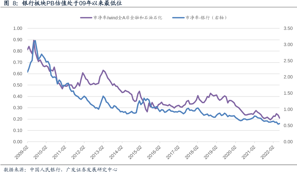 去年6月以来,板块先后经历了房企暴雷、上海疫情、金融反腐的冲击,银行指数估值持续下行,当前板块估值水平也处于历史低位。