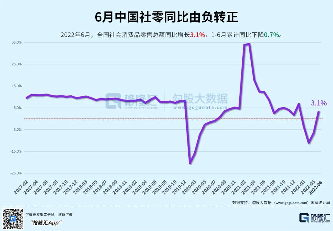 消费方面,6月社会消费品零售同比3.1%,明显好于上月的-6.7%,大幅超出市场预期。