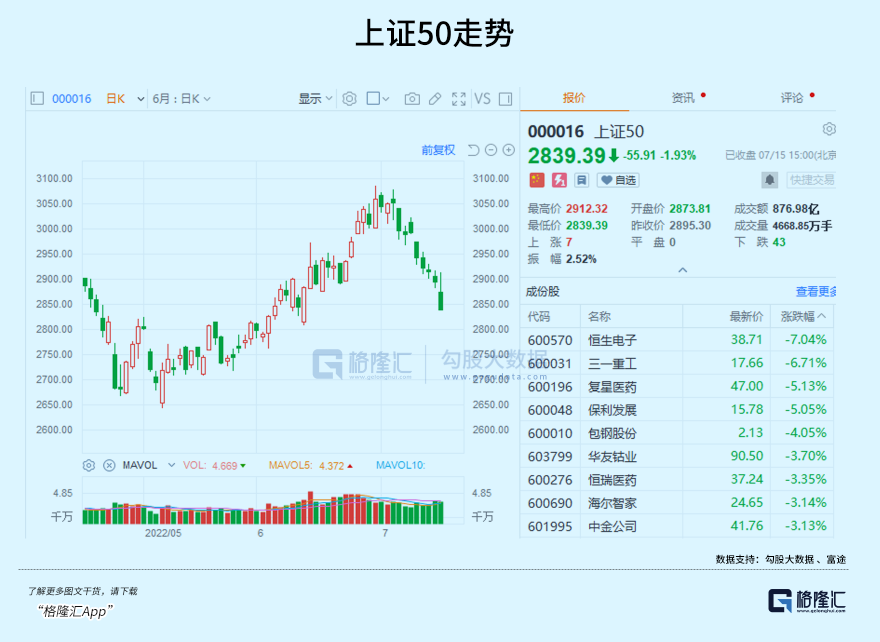 跟前几天一样,如果不是一些成长股在支撑,大盘的跌幅恐怕更加明显,看看上证50,已经连续多日阴跌了,从高点下来,跌幅接近8%。