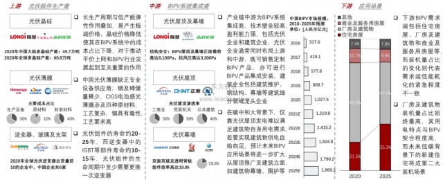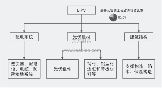 BIPV由配电系统(逆变器、配电柜、电缆和防雷接地系统)、光伏建材(光伏组件、钢材、铝型材边框和背板材料等)及建筑构造、防水和保温构造)组成。