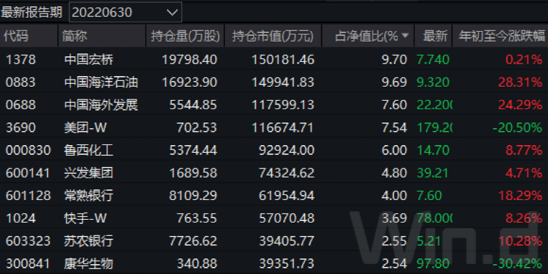 而在重仓股方面,今年一季度被丘栋荣重仓的互联网板块,二季度有所获利了结。最新二季报显示,丘栋荣管理的多只基金中,中庚价值领航基金从一季度末的不到80亿元增长至二季度末的154.75亿元,随着规模大增,该基金旗下多只重仓股都有了不同程度增持,前三大重仓股中的中国宏桥、中国海洋石油、中国海外发展二季度分别增持1.05亿股、8109万股、3636万股,相比一季度增持比例分别达到113.74%、92.01%、190.47%,中国宏桥更是取代美团,成为该基金第一大重仓股,美团则退居第四大重仓股,此外,前十大重仓股中还新增了兴发集团、康华生物两只个股,常熟银行、柳药股份退出前十大重仓股名单。尽管二季度股价反弹接近18%,但相比一季度,快手还是被逆势减持了18.38%。