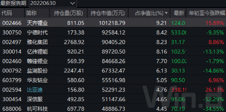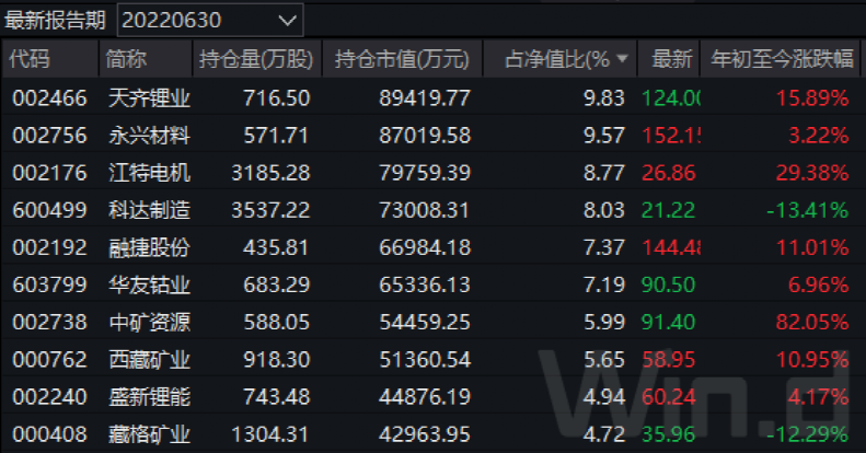 以国投瑞银新能源为例,截至二季度末,前十大重仓股中,新能源产业链个股占据7席,且以上游资源品占据绝对主力,合计占基金资产净值比例超过45%。其中,中矿资源、西藏矿业、科达制造成为基金新晋前十大重仓股,盐湖股份、东岳集团、北方稀土淡出;藏格矿业、华友钴业分别大幅增持300多万和200多万股,永兴材料也增持近50万股; 天齐锂业则减持超80万股。