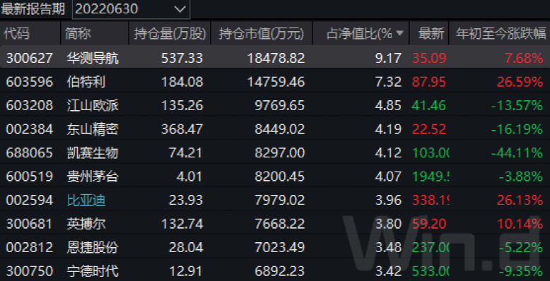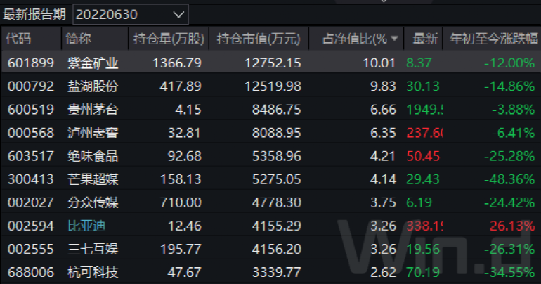 从重仓股变化上看,一季度重仓的包括金地集团、招商蛇口、保利发展在内的地产股以及兖矿能源等煤炭股在二季度均退出前十大重仓股名单,盐湖股份、比亚迪等新能源个股获得增持。除此之外,芒果超媒、分众传媒、三七互娱3只传媒股也在二季度新进前十大重仓股之列。