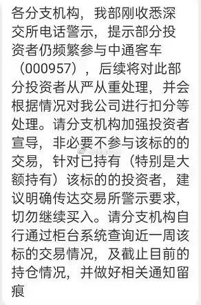 为何闪崩?wx群里流传了一则券商的消息,称接到电话,会对频繁参与中通客车交易的投资者从严从重处理,还考虑对券商进行扣分处理。
