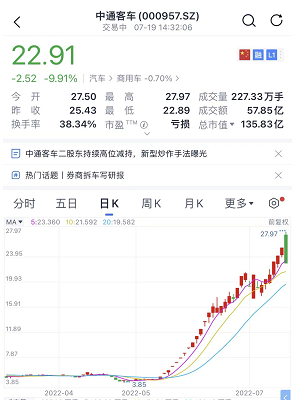 19日,近期最牛的妖股中通客车,上午拉涨停,近32个交易日累积涨幅超540%,结果到了下午,一张市场截图就把它打到闪崩跌停。5月以来,汽车板块成为A股炒作主线。中通客车是最近两个月A股第一“妖王”。中通客车同时还有“核酸检测车”概念。