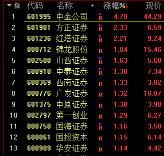 券商股异动拉升,中金公司涨近5%,方正证券、红塔证券、锦龙股份、山西证券等跟涨。