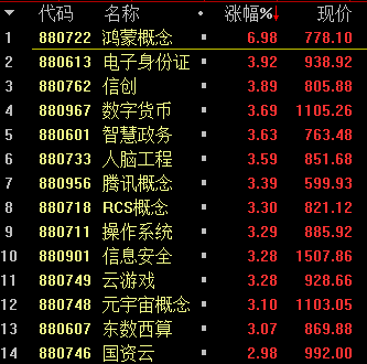板块方面,鸿蒙概念、数据安全、国产软件、云游戏等板块涨幅居前,电力、CRO、风电、储能等板块跌幅居前。