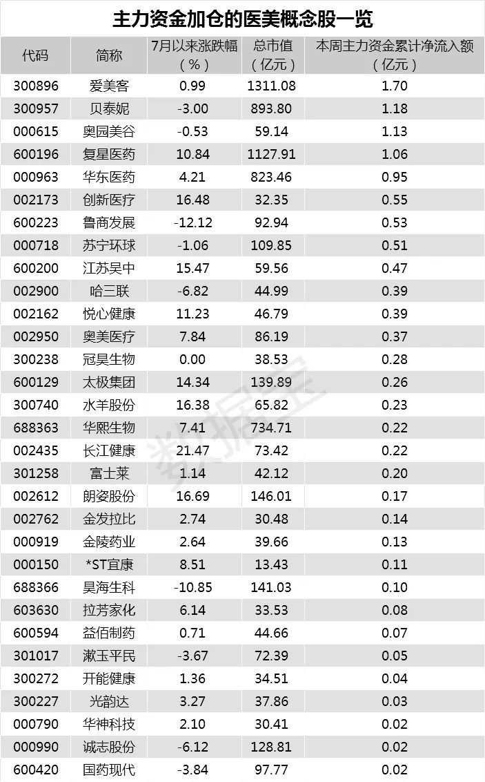 7月以来,医美板块个股股价平均上涨2.26%,跑赢大盘。长江健康、澳洋健康、朗姿股份等11股涨幅超10%。被称为“玻尿酸第一股”的华熙生物日增79亿元市值,股价盘中创下今年以来新高。