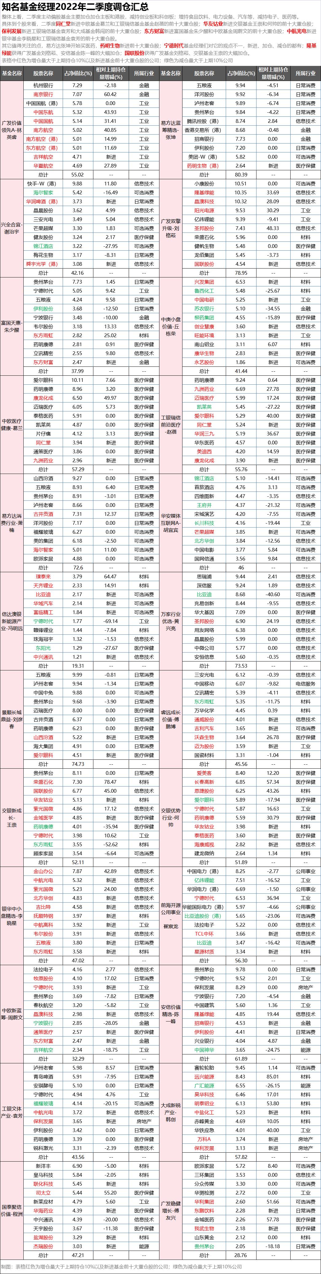 一图了解知名基金经理2022年二季度调仓汇总