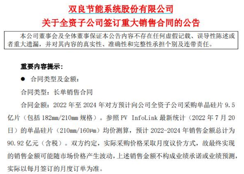 该合同约定2022年至2024年期间,双良节能预计向上述4家公司销售单晶硅片总计9.5亿片(包括182mm/210mm规格)。参照PV InfoLink最新统计的单晶硅片(210mm/160µm)均价测算,预计2022-2024年销售金额总计为90.92亿元(含税)。