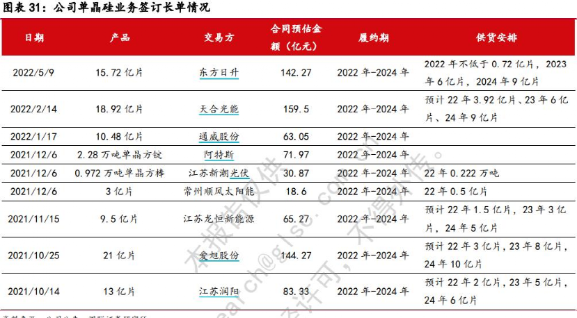 其中与特变电工的硅料供应订单长达八年时间,颇有锚定产能的意味。公司方面也表示,签订供应长单目的为确保已签大尺寸单晶硅片销售订单如期交付。