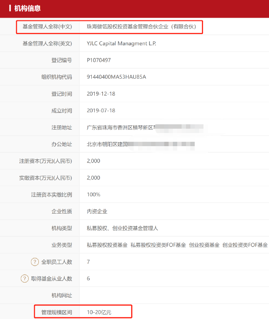 早在2019年7月,伊利就出资设立了珠海健瓴,注册资本2000万人民币。随后2019年12月,珠海健瓴在基金业协会完成备案登记,机构类型是私募股权、创业投资基金管理人。目前公司的管理规模区间在10-20亿元。