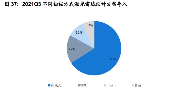 全球激光雷达市场设计方案导入或以机械式(含转镜、棱镜)方案为主,未来有 望由混合固态过渡到固态方案。机械式激光雷达的扫描系统中,需要高可靠性的 旋转电机和多个激光发射器,同时多部件结构所需的系统综合制造成本也较高, 因此整体成本较高。MEMS 激光雷达发射和接收激光器大幅减少,当前受限于 MEMS 振镜价格较高,大规模量产后 MEMS 振镜有望降低至 30-50 美元,或具 备成本优势;但 MEMS 激光雷达接收端的收光孔径较小,光接收功率远低于机 械式激光雷达,因此具有信噪比低、有效距离短及 FOV 窄的缺点。