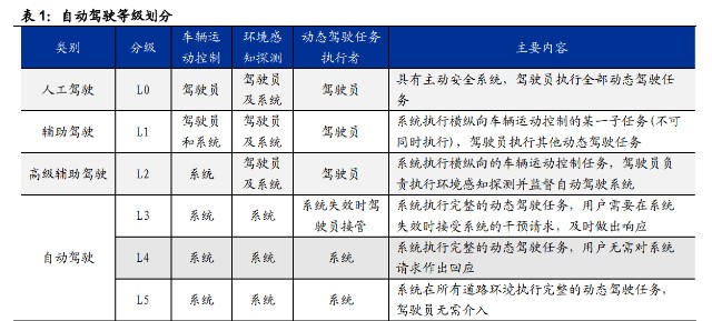智能驾驶采用不同类型的传感器实现车辆对周边道路、行人、障碍物、路侧单元 及其他车辆的感知,在不同程度上实现车辆安全、自主、智能驾驶,是激光雷达 的重要应用场景,可根据驾驶员与自动驾驶系统参与程度分为五个等级。