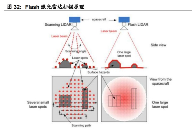 Flash 激光雷达优点是无扫描器件、成像速度快,缺点是激光功率受限、探测距 离近、抗干扰能力差。Flash 激光雷达利用激光器同时照亮整个场景,对场景进 行光覆盖,一次性实现全局成像,故也称为闪烁式激光雷达,工作原理与数字照相机类似。