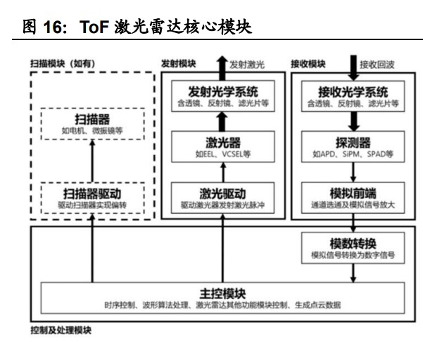 ToF(Time of Flight)与 FMCW(Frequency Modulated Continuous Wave)能 够实现室外阳光下较远的测程(100~250m),是车载激光雷达的优选方案。ToF 是目前市场上车载中长距激光雷达的主流方案,FMCW 激光雷达整机和上游产 业链仍处于发展期。 ToF 即飞行时间测距方法,通过测量光等信号在发射器和反射器之间的“飞行时 间”来计算出两者间距离。ToF 激光雷达系统主要包括发射模块、接收模块、控 制及信号处理模块和扫描模块,通过激光器发射激光并利用二极管检测目标物体 反射的激光回波,通过高精度计时器测量激光发射与接收到目标物体反射回波的时间差,进一步用时间差乘以光速即可得到目标物体的相对距离。