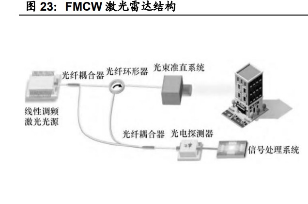 近年来国内外多家 VCSEL 激光器公司纷纷开发了多层结 VCSEL 激光器,将其 发光功率密度提升了 5~10 倍。2021 年,Lumentum 发布了新款高功率、高效 率的五结和六结 VCSEL 阵列,每个发射孔的光功率超过 2W,从而使得 1 平方 毫米 VCSEL 阵列的峰值功率超过 800W。功率密度提升为应用 VCSEL 开发长 距激光雷达提供了可能,结合其平面化所带来的生产成本和产品可靠性方面的 收益,VCSEL 未来有望取代 EEL。 FMCW 激光雷达的光源不同于 ToF 激光雷达,窄线宽的线性调频光是实现相干 检测的基础。目前商用的能够实现窄线宽输出的激光器有四种类型:分布式反馈 激光器(DFB)、分布式布拉格反射激光器(DBR)、外腔激光器以及通过窄线宽 激光器的种子元加上外调制的方案。