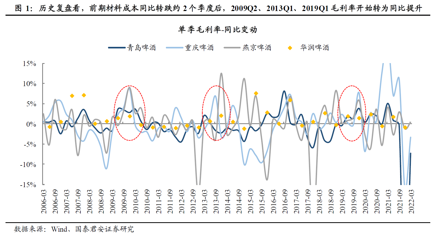 国泰君安复盘历史来看,2006年以来啤酒行业出现过三轮较明显的成本上涨,分别在2007-08、2011-12、2017-18年,这三轮成本上涨之后均出现回落,对啤酒公司后续毛利率回升具有贡献。对应股价来看,