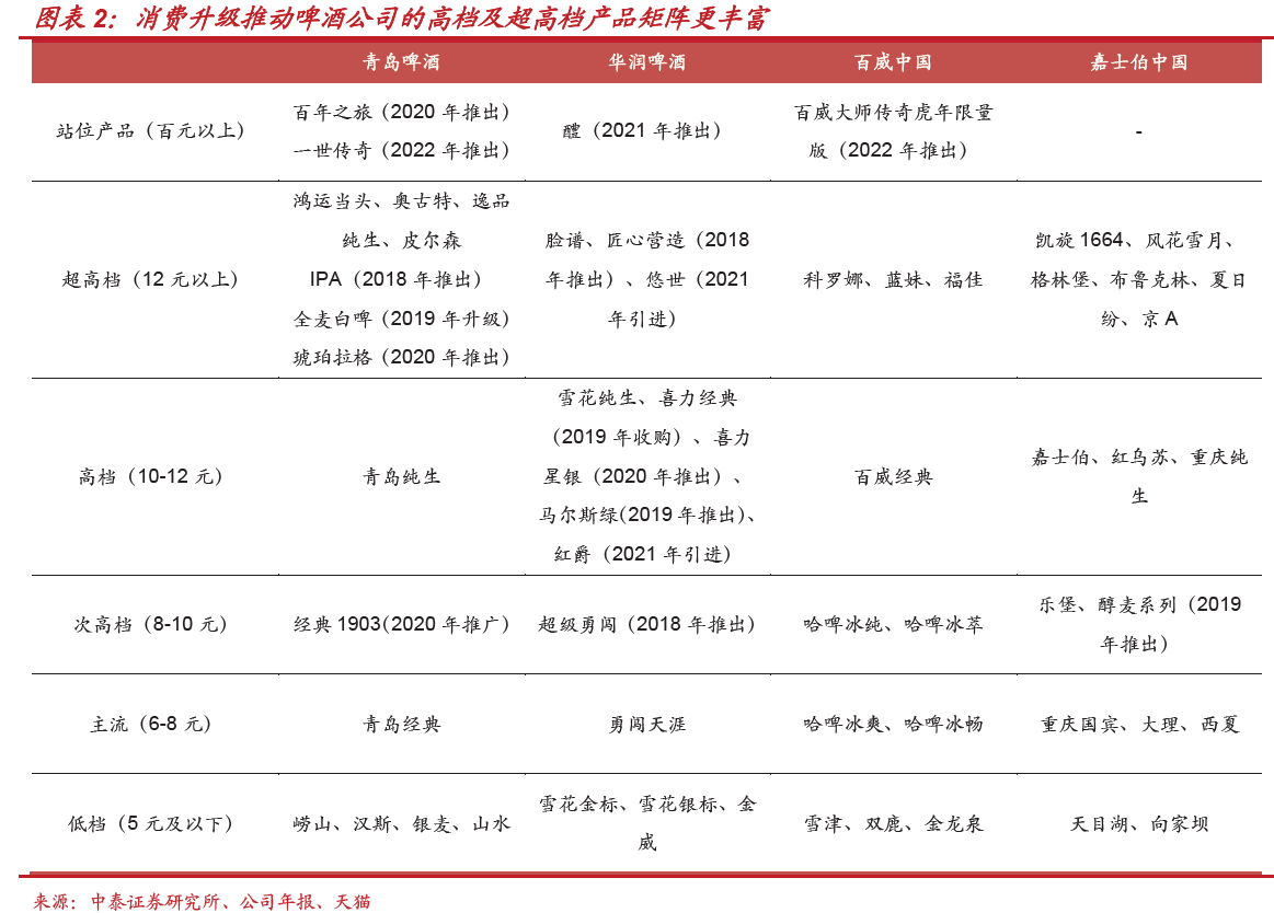 时至今日,各家公司积极布局高档及超高档啤酒,产品矩阵更加丰富。