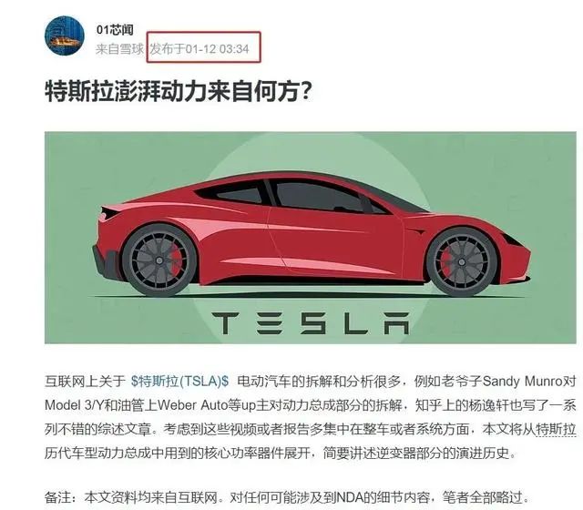 记者搜索发现,雪球用户“01芯闻”确实于今年1月发布了《特斯拉澎湃动力来自何方?》一文。
