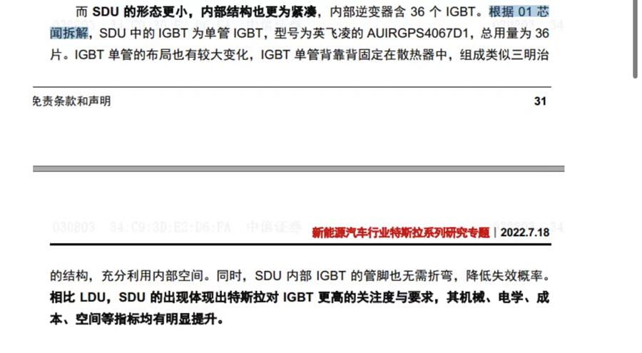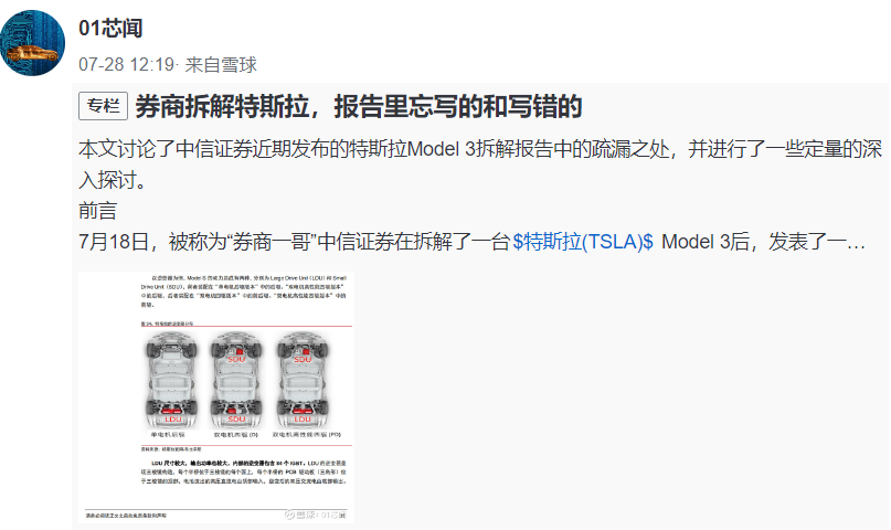 7月29日中午,雪球用户“01芯闻”发帖称,“中信证券的这份研报的有关部分涉嫌抄袭了其之前发表的原创文章,“作为智能电动汽车核心部件之一的电动动力总成,特别是逆变器部分,研报中却没有提供多少原创内容。30-32页对特斯拉上一款车型Model S动力总成回顾,其内容和配图几乎都是从笔者之前的原创文章《特斯拉澎湃动力来自何方?》而来,仅是重组了语句,拆分了图片。”