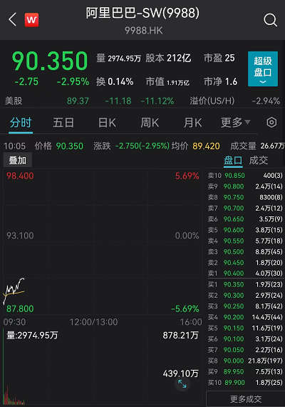 8月1日早间,阿里巴巴盘前低开5.37%,报88.10港元,盘前成交额5.55亿港元。截止发稿,阿里巴巴跌幅收窄至3%。