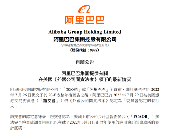 阿里巴巴公布,继2022年7月26日提交了其20-F表格年度报告之后,阿里巴巴于2022年7月29日被美国证券交易委员会依《外国公司问责法案》认定为“委员会认定的发行人”。
