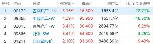 8月1日上午,港股市场上新能源汽车股走高,港股吉利汽车涨5%,小鹏汽车涨4%,理想汽车、蔚来涨3%,比亚迪股份、长城汽车涨约2%;A股比亚迪涨2%,长城汽车涨1.7%,广汽集团、长安汽车涨约1%。