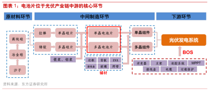资料显示,光伏电池片环节属于光伏产业链中游,上游是单多晶硅片,下游是组件。