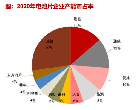 市场竞争格局方面,相较光伏主产业链其他环节,电池格局较为分散,以2020年主要企业产能统计,排名前三的分别是隆基、通威和爱旭,占比分别为14%、13%和10%,格局较为分散。