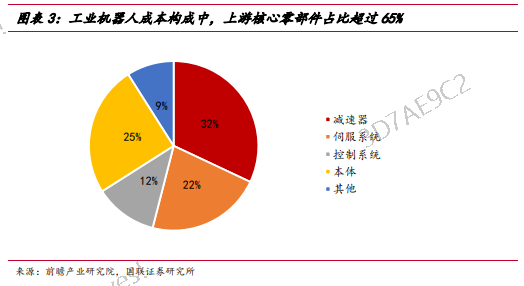成本构成方面,工业机器人的核心零部件主要为减速器、伺服系统和控制系统,分别为32%、22%和12%,成本占比超过65%,其中零部件中减速器的价值量较大。