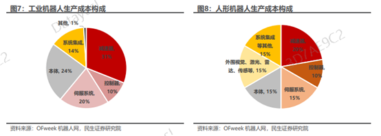 所以在本体上的生产成本,工业机器人要比人形机器人要高,但是在人形机器人需要全身安装多处传感器,因此这部分的成本要比较高。