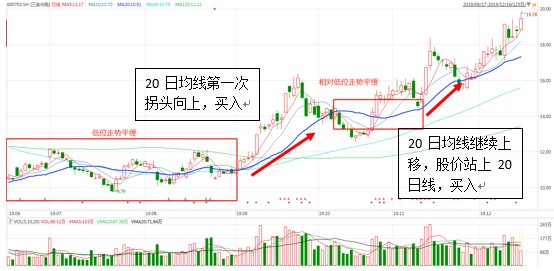 2)当20日均线开始向上拐头,股价站上20日线时买入;股价回调时可以沿着20日均线低吸加仓;