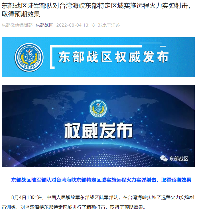 8月4日13时许,中国人民解放军东部战区陆军部队,在台湾海峡实施了远程火力实弹射击训练,对台湾海峡东部特定区域进行了精确打击,取得了预期效果。