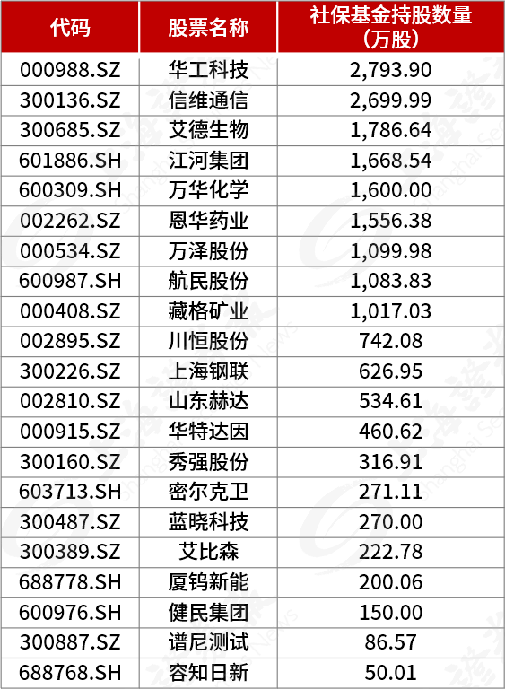 其中,二季度末,社保基金持股数量最多的是华工科技,2个社保组合持股数量超过2793万股,信维通信被全国社保基金103组合持股近2700万股,艾德生物、江河集团、万华化学等7家上市公司也被不同的社保基金组合持仓超过1000万股。