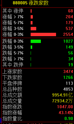 个股涨多跌少,两市超3400股飘红,今日成交9954亿元。