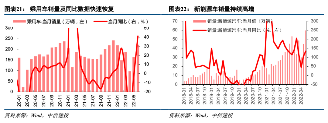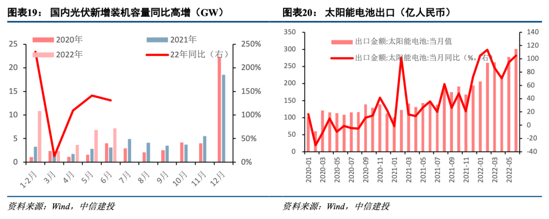 光伏方面,当前需求维持旺盛,产业链价格仍在走高。6月光伏装机维持高增,新增装机量达7.17GW,同比增长131%,与5月基本持平;海外需求维持旺盛,6月太阳能电池出口金额较5月份同比增幅进一步上升,达到104.9%。7月产业链价格高位背景下,龙头组件厂商在旺盛需求拉动下排产仍有微增,下半年硅料产出环比有望提升背景下,旺季装机增速将继续改善。新能源车方面,7月淡季虽小幅回调,但后续销量有望加速。据中汽协,6月新能源车销量超预期达56.9万,同比增136%,环比增33%;或受乘用车购置税影响,渗透率小幅回落,6月环比降0.7pct至25.6pct,但仍处于快速提升通道。据乘联会,7月新能源乘用车厂家批发销量基本有望与6月持平,同比增约120%,淡季虽有小幅正常回调但仍实现极高景气表现。预计Q3旺季排产继续加速,且下半年新车型上市背景下有望进一步催化销量。