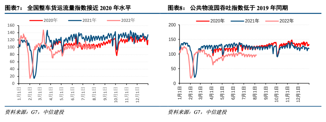 国内经济基本面依然疲弱:PMI指数7月跌至49.0,PMI新订单指数更是跌至48.5,反映出库存去化压力下,制造业需求较差。另一个值得注意的指标是中国企业经营状况指数BCI,7月仅为44.31依然大幅低于荣枯线,反映出当前大量(中小)企业经营困难,复苏的脆弱性不容忽视。G7提供的全国物流数据从另一个侧面反映了当前经济恢复的现状,从公共物流园吞吐指数来看7月以来经济热度有所降温。近期海南等疫情可能对短期居民出行/旅游热情造成一定影响。