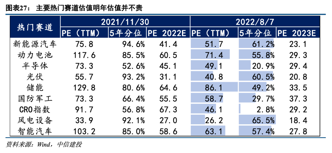 从行业景气视角看,目前22年主要热门赛道如新能源/发电汽车等在产业周期及政策驱动下业绩尚未出现拐点担忧。购置税减免刺激下乘用车销量Q4仍有望加速,光伏、新能源车四季度旺季仍有进一步上行预期。相对稳增长、顺周期与消费预期偏弱,风电、光伏、新能源车等方向景气优势相对去年底目前也更为明显,且当前估值不及2021年高点水平,明年估值也并不贵。若风电、光伏、新能源车等行业如果因为拥挤产生波动回撤,在景气趋势向好支撑下,大概率不是中期趋势拐点。