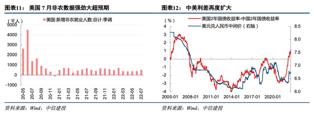 全球通胀高企,9月加息力度仍需警惕:周五公布的数据表明7月美国非农数据强劲,非农就业人口增加52.8万人,大幅超过此前25万人的预期值。5月和6月数据同时被上修,修正后,5月和6月的新增就业人数总和较此前报告的要高2.8万人,另外7月失业率跌至3.5%,好于市场预期的3.6%,创2020年2月以来新低。受此影响,市场对于美联储9月继续大幅加息的预期再度上升。