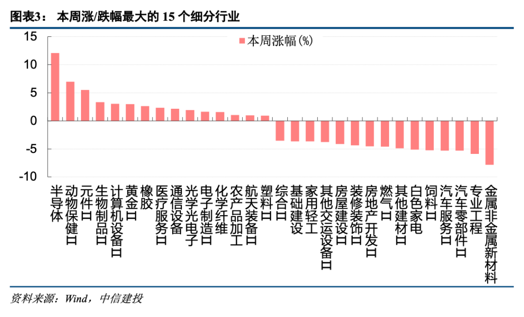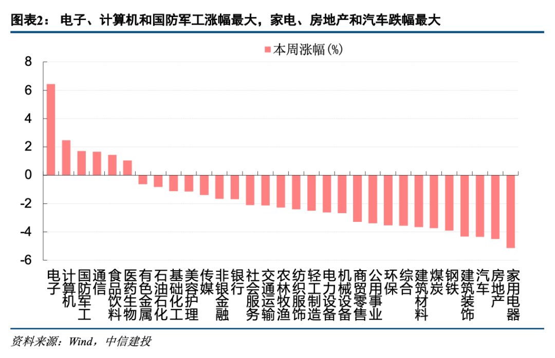 ②地产链、基建链等偏顺周期和稳增长的板块跌幅明显:本周家电、房地产和汽车指数分别下跌5.14%、4.50%和4.36%,建筑装饰、钢铁、煤炭、建筑材料等也有明显下跌。