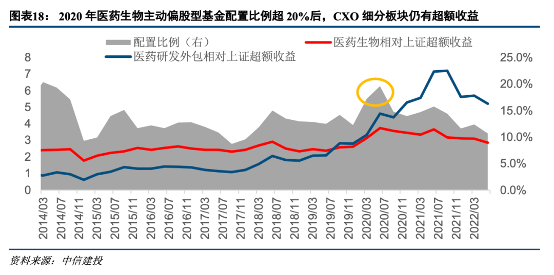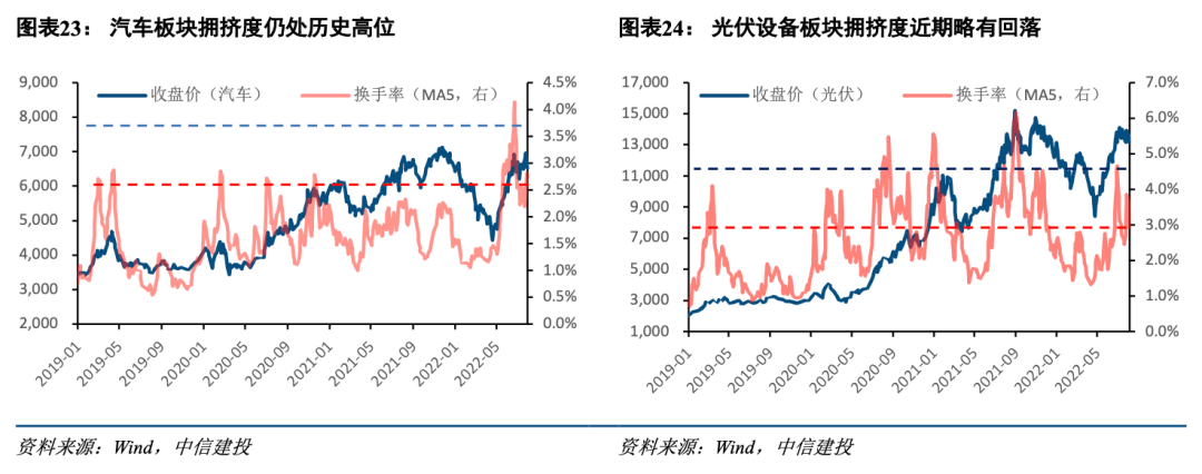 汽车、光伏等热门赛道景气预期依旧向好,但从交易热度层面看,换手率仍处5年80%+以上高位(汽车/新能源车/光伏/军工换手率5年分位97%/81%/85%/91%),不过近期已经开始处于回落趋势。基金超配比例也至2019年来高位(新能源整车/光伏/军工22Q2超配比例分别为0.9%/5.2%/1.0%)。基金配置比例视角显示,半年报电气设备行业基金配置已经达到20%的“极限”配置水平,从2020年主动偏股型基金配置比例超20%后看医药生物指数和细分子板块表现可得,尽管指数层面因拥挤度较高难以获得明显的超额收益,但自身景气向上的CXO板块仍持续跑赢上证综指。