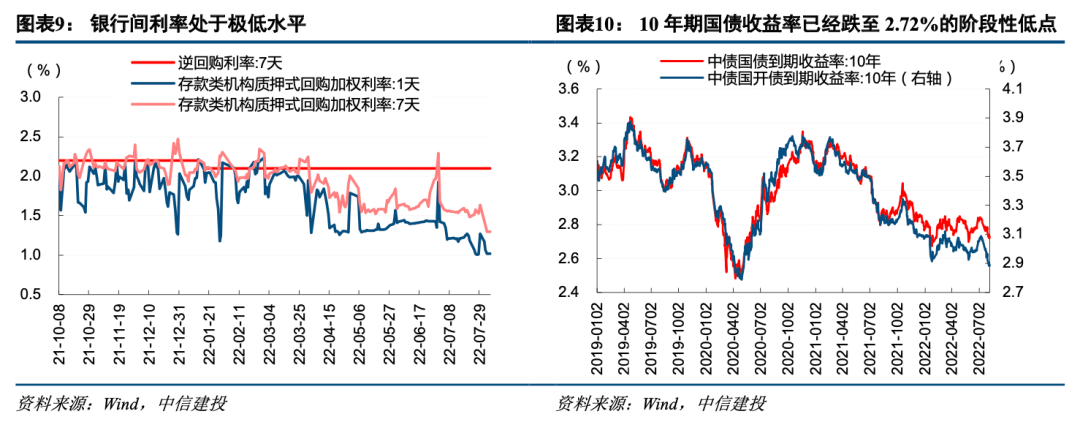 利率处于阶段性低位:我们此前的中期策略展望指出基本面修复偏弱+宏观流动性充裕是今年下半年的主基调。从当前情况来看,银行间利率已经长期低位水平,DR007跌至1.3%,DR007跌至1.0%,均大幅低于2.1%的政策利率水平。十年期国债收益率本周也同样再度回落,已经降至2.72%的阶段性低点。
