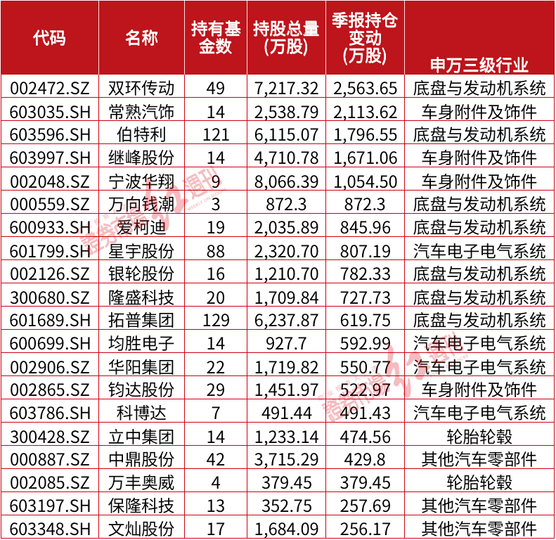 据Wind数据不完全统计,在基金二季报中,有70只汽车零部件公司获得基金持仓,其中,有逾40只获得基金的整体增仓,占比约6成。