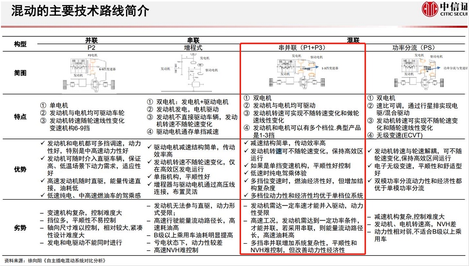 其表示。串并联双电机的架构是混动的必然趋势,其中丰田的功率分流技术由于专利的壁垒,导致自主品牌难以借鉴。而基于双电机串并联的DHT架构专利相对容易绕过,是自主品牌接下来重点发展的方向,也极有可能成为混动的终极技术。