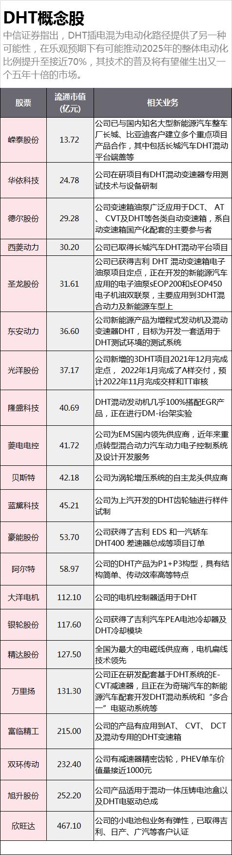 中信证券指出,插电混动车型作为车企电动化的一条技术路线,曾在过去几年中备受争议,但DHT技术改变了PHEV的趋势,有望助混动快速放量。
