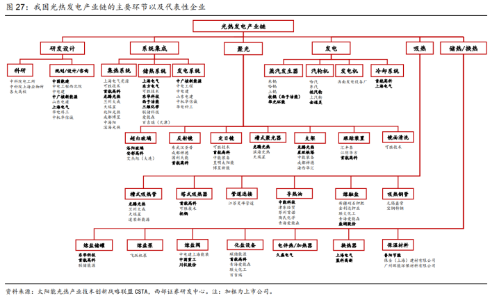 光热发电的产业链可以分为基础材料、装备制造、电站EPC、电站运营、电力输配等几个环节。目前我国光热发电产业链条完整,但规模还较小,不少领域发展时间较短,核心环节在于装备制造和电站EPC。