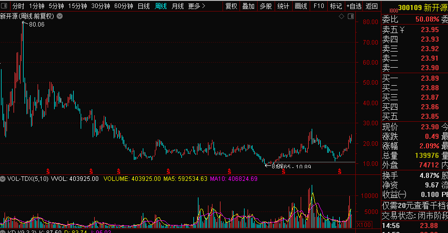 今天说一个新票:新开源。这票的技术面走势跟新亚电子一样,属于长期底部横盘,目前有冲高走主升浪的趋势。