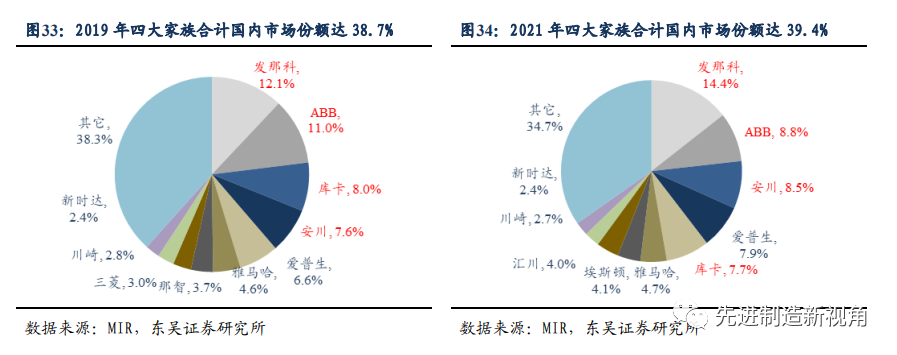 外资垄断高端市场,国产机器人迎黄金替代期。短期来看,疫情&缺货给国产厂商在交货期方面带来较大优势,同时新能源领域需求旺盛,部分客户会选择国产产品进行替代,国产厂商有望凭借强大的学习能力迅速迭代产品,逐步缩短与外资的技术差距;长期来看,新能源产业链的迅速发展有望改变机器人原有格局。汽车行业长期以来是机器人使用量最大,且对性能要求最高的场景,一直都是四大家族的基本盘。新能源领域在迅速发展的背景下,有望替代汽车成为机器人最大应用场景。新能源用机器人对性能要求低于汽车用机器人,且更关注性价比,国产机器人在与四大家族的竞争中会获得更多的优势。