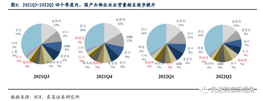 同时锂电新能源等新兴领域进入投资扩产高峰期,对工业机器人的需求日益高涨,为国产品牌带来机遇。其中头部企业尤为受益,2022Q2 国内出货量排名前十中,汇川、埃斯顿和新时达分别位列第 4、第 5 和第 9,过去四个季度国产头部企业排名逐步提升。
